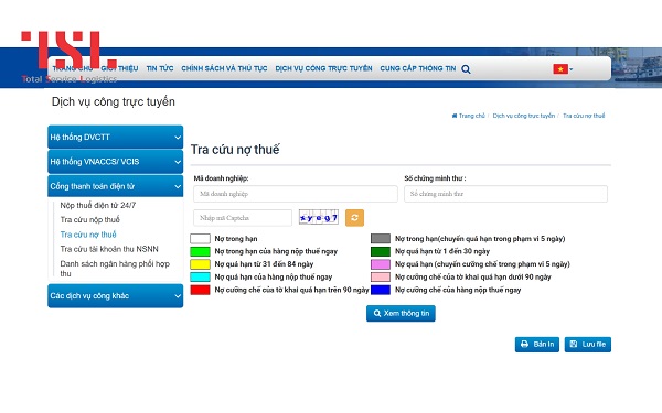 Tại giao diện tra cứu, bạn cần nhập mã số doanh nghiệp và thông tin CCCD hoặc CMND của người đại diện theo pháp luật để hệ thống xác thực dữ liệu. Sau khi hoàn tất, kết quả tra cứu sẽ hiển thị tình trạng nợ thuế của doanh nghiệp thông qua các màu sắc phân loại rõ ràng. Trong đó, màu đỏ thể hiện doanh nghiệp đang nợ thuế tờ khai trên 90 ngày, đây là dấu hiệu cảnh báo quan trọng có thể ảnh hưởng trực tiếp đến việc mở tờ khai mới và thông quan hàng hóa trong tương lai.
