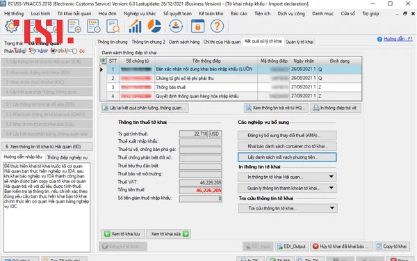 Tiếp theo, trong phần thông tin tờ khai, người khai chọn đến mục kết quả tờ khai để kiểm tra trạng thái xử lý. Sau đó, thực hiện thao tác lấy danh sách mã vạch và chọn chức năng khai báo theo hướng dẫn của phần mềm ECUS. Hệ thống sẽ hiển thị một cửa sổ mới, tại đây người dùng tiếp tục chọn lấy phản hồi để ECUS nhận dữ liệu trả về từ hệ thống hải quan điện tử. Cần lưu ý rằng, tờ khai chưa được thông quan hoặc chưa đủ điều kiện xử lý sẽ không thể lấy mã vạch, do đó cần kiểm tra lại trạng thái tờ khai trước khi thao tác. Khi hệ thống đã trả về đầy đủ thông tin và mã vạch tờ khai hải quan, người dùng chỉ cần chọn in mã vạch tờ khai để hoàn tất quá trình.