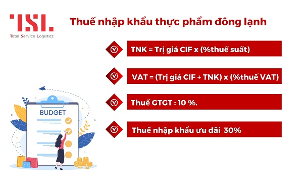 Bên cạnh thuế nhập khẩu, doanh nghiệp còn phải nộp thêm thuế giá trị gia tăng (VAT) cho hàng nhập khẩu. Đối với thực phẩm đông lạnh, mức VAT hiện nay là 8%